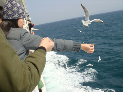 午餐後,便前往碼頭搭乖島原渡輪到熊本市,從島原到熊本船程約1小時,遊覽車是直接開上船後,乘車再下車到船艙內坐位或是甲板上,同樣要下船時,乖客也需回到原本的車上,整台車一起開下船。沿途有許多海鷗跟著船飛,當然是貪途遊客手上的零食啦,我們也拿了一包零食來餵食海鷗,海鷗們個個都是接零食的高手哦!