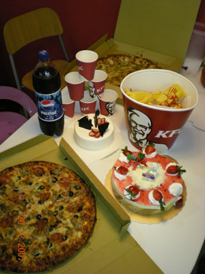 接著就開始吃大餐啦,不能少的就是芝加哥披薩,吃過的都說讚,比一般電視廣告的披薩好吃多啦~,還有2個小蛋糕跟肯德雞外帶全家餐~,嗯~看似不多,不過大家都吃的飽飽飽呢!